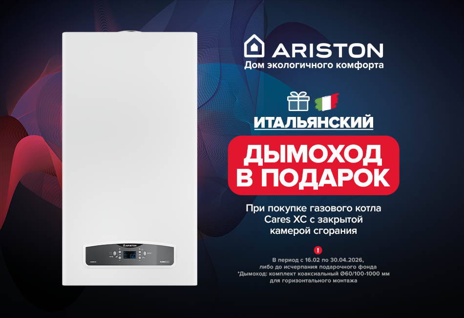 При покупке газовых котлов линейки Cares XC с закрытой камерой сгорания от АRISTON коаксиальный дымоход (d 60/100-1000мм) в подарок.