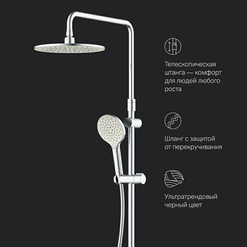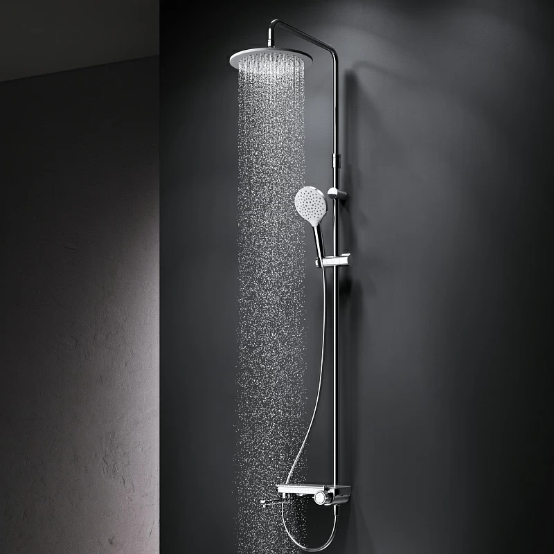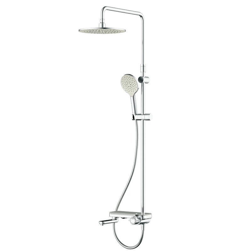 В комплектацию душевой системы входят: тропический душ, ручной душ, смеситель-полочка