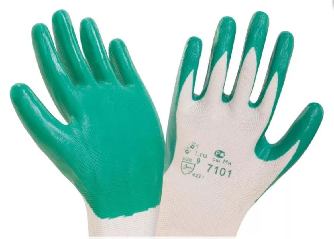 Перчатки трикотажные, нитриловое покрытие, бело-зеленые, 2Hands