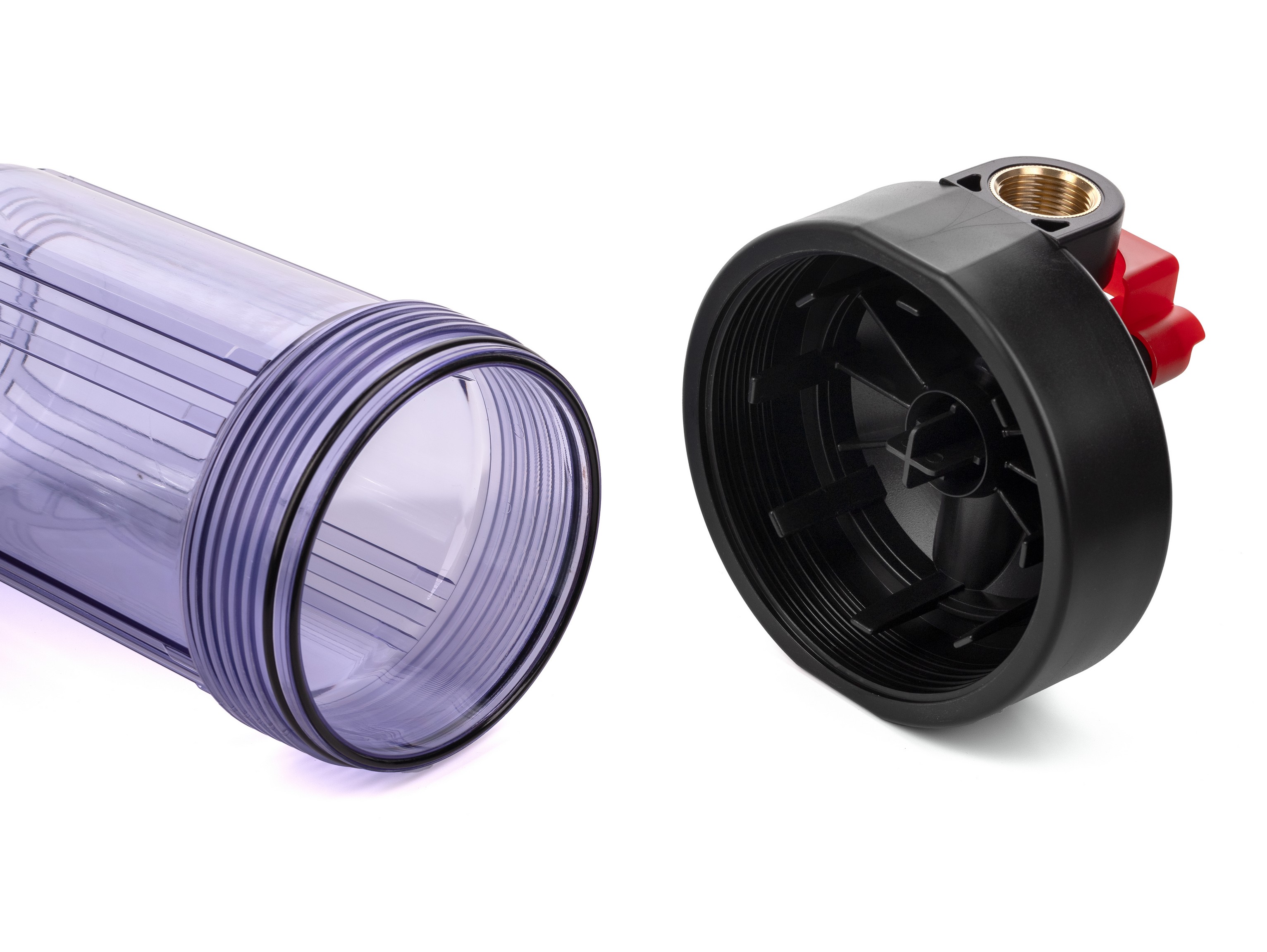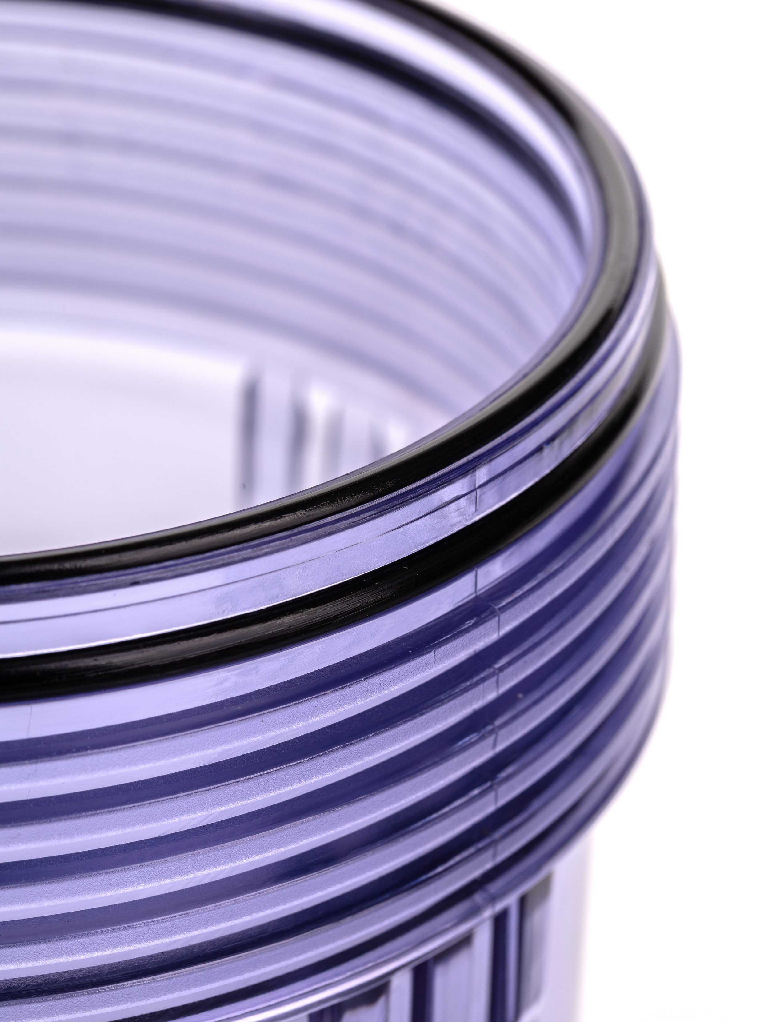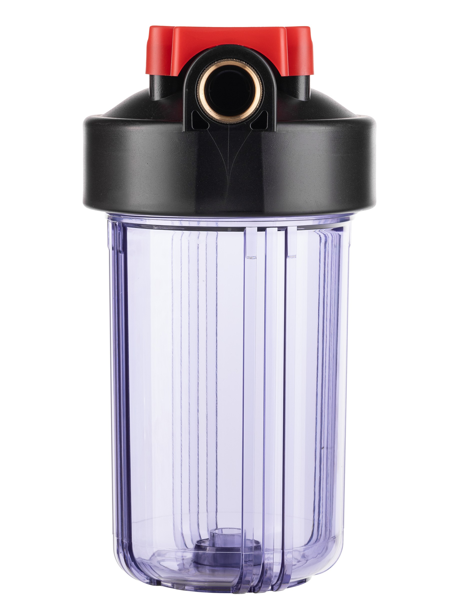 Корпус Гейзер 10BB прозрачный выполнен из ударопрочного пластика, рассчитан на работу под давлением и установку на входе в систему холодного водоснабжения.