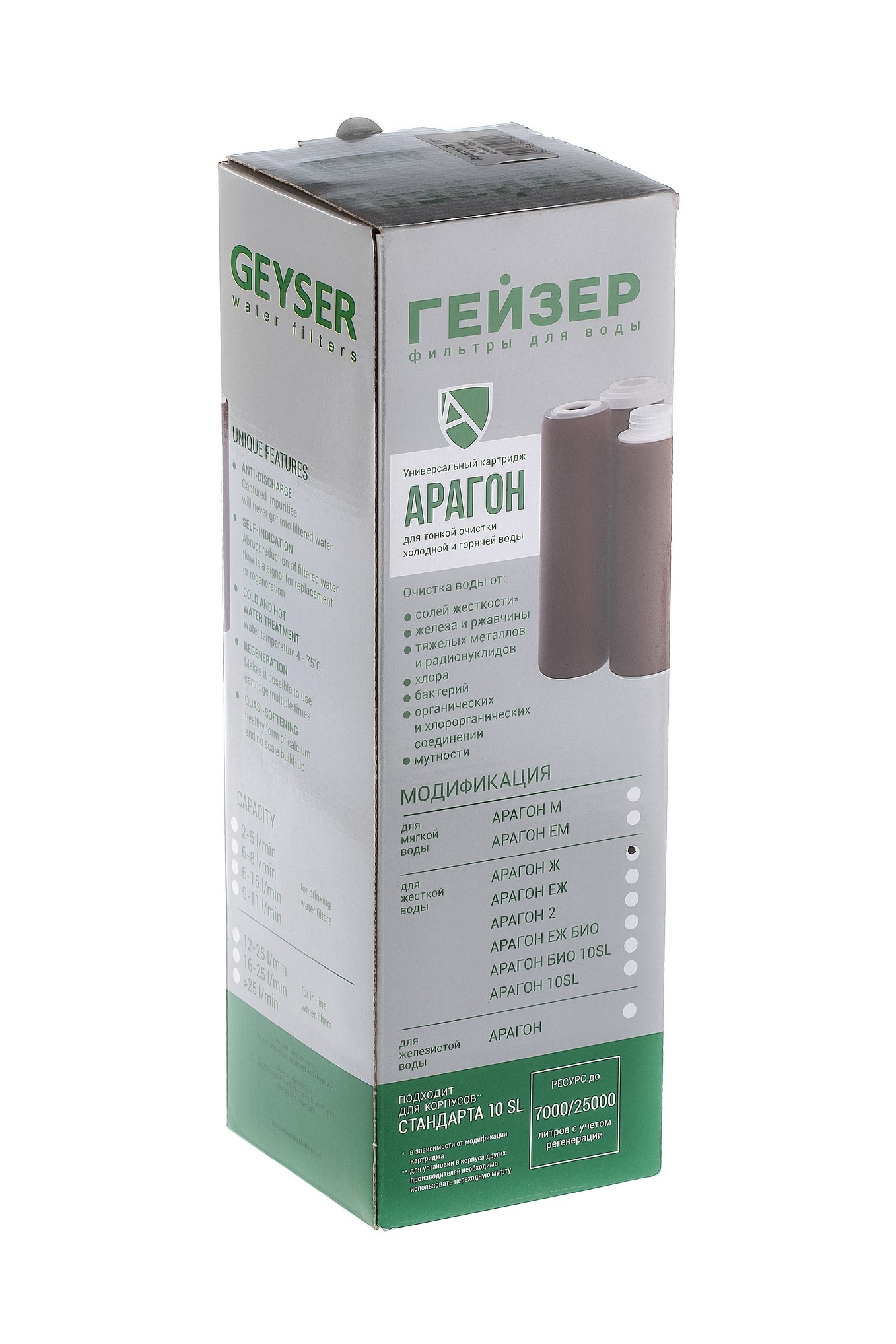 Картриджи Арагон Ж с производительностью 9-11 л/мин предназначены для установки в настольные фильтры «Гейзер».