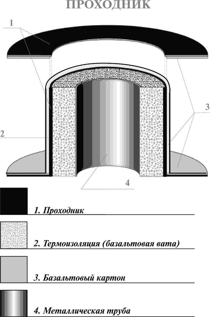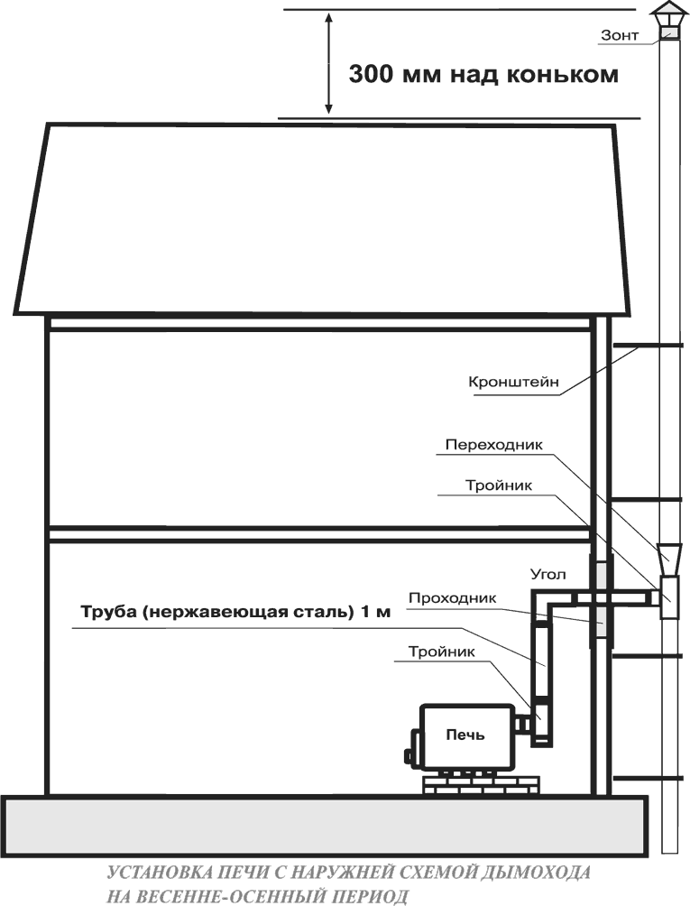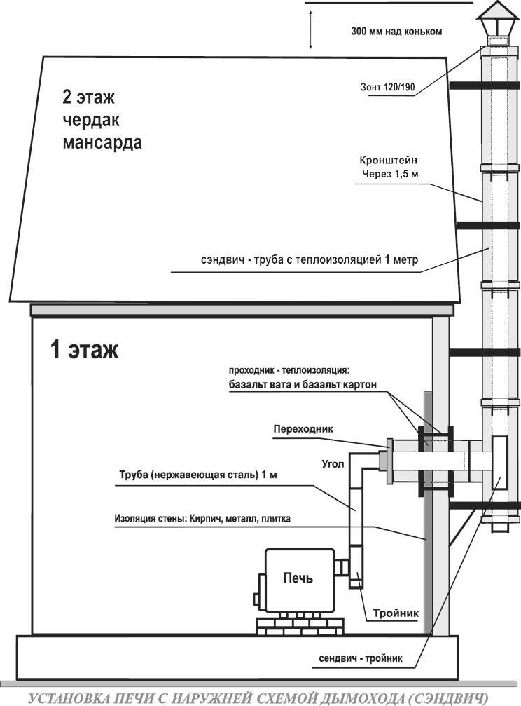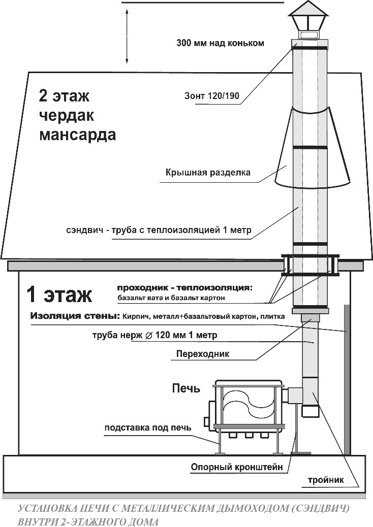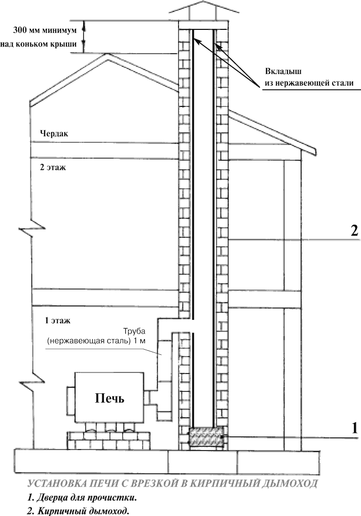 ДЫМОХОД. Согласно СНиП 41-01-2003 “Отопление, вентиляция, кондиционирование” (п. 6.13) дымовые трубы следует проектировать вертикальными, без уступов, из кирпича со стенками толщиной не менее 120 мм или из жаропрочного бетона толщиной не менее 60 мм. Необходимо предусмотреть в их основании карманы глубиной 250 мм с отверстиями для очистки, закрываемые чугунными дверками. В кирпичные и бетонныетрубы необходимо устанавливать вкладыш из нержавеющей стали толщиной не менее 0,5 мм во избежании разрушения дымохода от воздействия конденсата. Допускается установка дымовых труб из сборных изделий, выполненных из нержавеющей стали толщиной 1 мм заводского изготовления (коаксиальных стальных труб (сэндвичей) с внутренним заполнением из негорючего теплоизоляционного материала) при этом размеры разделок указанных дымовых труб в месте примыкания строительных конструкций и расстоянием между наружними поверхностями дымовых труб и стеной, перегородкой и другими конструкциями здания следует выполнять с учетом требований приложения к СНиП 41-01-2003 “Отопление, вентиляция, кондиционирование”. Расстояние от наружных поверхностей кирпичных или бетонных дымовых труб до стропил, обрешеток и других деталей кровли из горючих или трудногорючих материалов следует предусматривать в свету не менее 130 мм, от керамических труб без изоляции – 250 мм, а при наличии негорючей теплоизоляции с сопротивлением передачи 0,3 кв.м. х град.С/Вт – 130 мм. Металлический и асбоцементный дымоходы должны иметь теплоизоляцию из минеральной ваты, керамзита или подобных материалов толщиной не менее 80 – 120 мм, что предотвратит появление конденсата и обеспечит оптимальную работу печи. Размещать дымоходы следует в удобных для потребителя местах внутри или снаружи здания согласно прилагаемым схемам. Допускается размещение дымохода в несгораемых стенах. Диаметр дымохода должен быть не меньше дымоотводящего патрубка печи. Печь должна иметь обособленный дымовой канал.