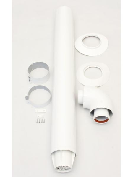 Комплект для прохода через стену или крышу (длина 750 мм). Состоит из: участка трубы для отвода продуктовсгорания/притока воздуха ∅ 60/100 длиной 750 мм; коаксиального отвода 90°; оголовка дымохода; соединительных хомутов, прокладок и крепежных винтов; 2-х декоративных манжет (внешней и внутренней) из материала EPDM для оформления прохода через стену.