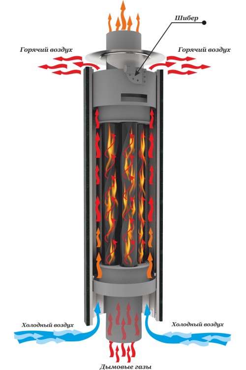 Дымовые газы, проходя через дымоход экономайзер, закручиваются и отдают тепло по максимуму. Изготавливается из черной стали. Дымоход рассчитан на весь срок службы печи. Использование дымохода-экономайзера помогает быстрее прогреть