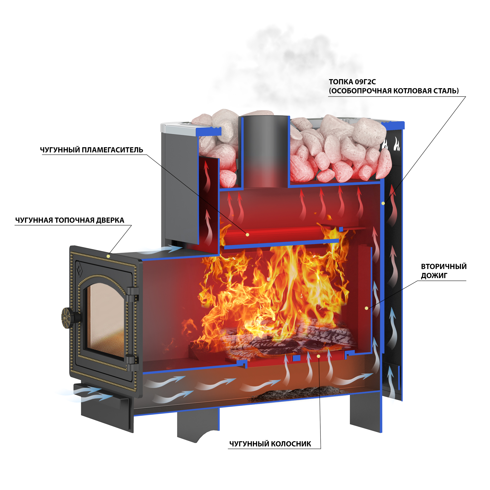 Стальная топка имеет скошенные углы в нижней части боковых стенок, что делает уход за топочным пространством максимально простым, а эффективность сгорания дров – максимальным.