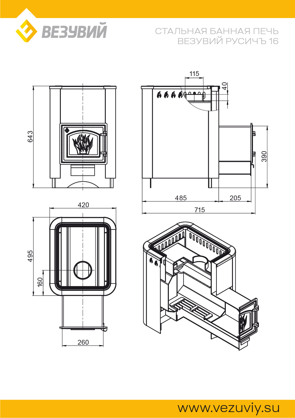 Конвекционная банная печь ВЕЗУВИЙ Русичъ Антрацит 16 (ДТ-3С) изготовлена из особо прочной котловой стали марки 09Г2С толщиной 4-6 мм и может устанавливаться в парную объёмом от 8 до 18 кубических метров.