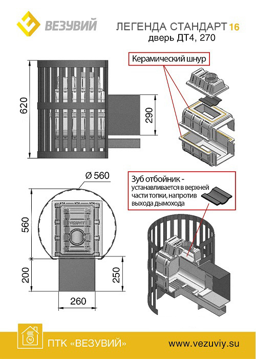 Преимущество печи в том, что топка печи состоит из 3-х элементов. На стыке между ними используется керамический шнур с рабочей температурой 1200 градусов. То есть топка печи абсолютно герметична!