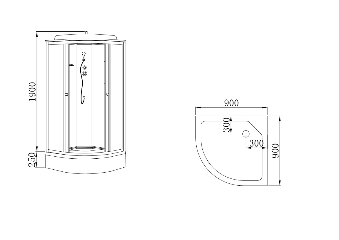 Душевая кабина угловая, размер: 90х90х215 см без гидромассажа, средний поддон 25 см с сифоном, задние рифленые неокрашенные стекла 0,4 см, рифленые передние стекла 0,4 см, алюминиевые профили цвета матовый хром, крыша, верхний душ, ручной душ, смеситель, полка.