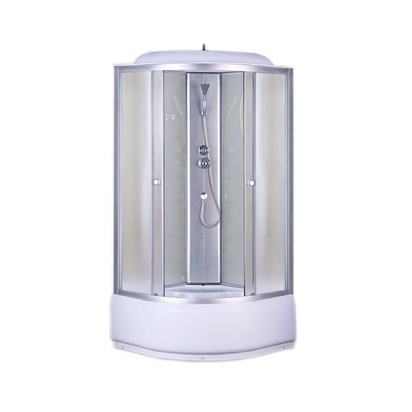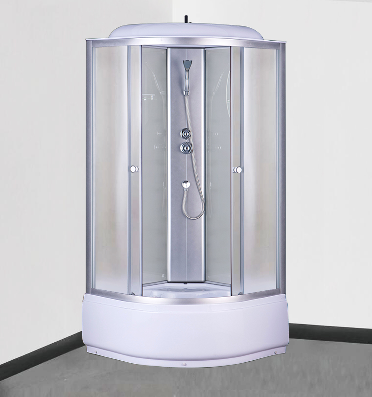 Душевая кабина угловая, размер: 90х90х215 см без гидромассажа, высокий поддон 40 см с сифоном, задние рифленые неокрашенные стекла 0,4 см, рифленые передние стекла 0,4 см, алюминиевые профили цвета матовый хром, крыша, верхний душ, ручной душ, смеситель, зеркало, полка.