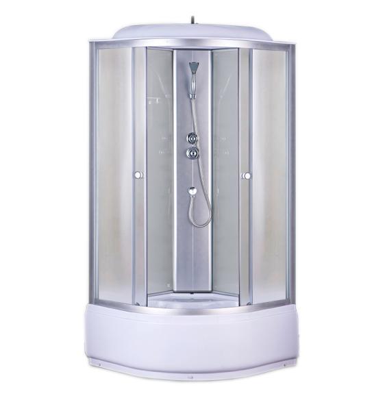Душевая кабина угловая, размер: 90х90х215 см без гидромассажа, высокий поддон 40 см с сифоном, задние рифленые неокрашенные стекла 0,4 см, рифленые передние стекла 0,4 см, алюминиевые профили цвета матовый хром, крыша, верхний душ, ручной душ, смеситель, полка.