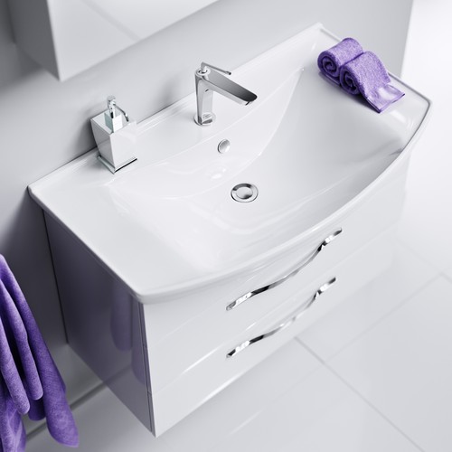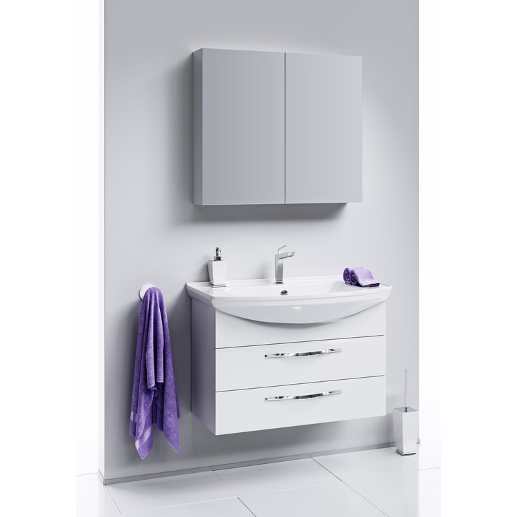 Линейка мебели представлена как напольными, так и подвесными тумбами в пяти размерах: 50, 65, 75, 85 и 105 см по ширине. Гарнитуры комплектуются керамическими умывальниками производства российского завода Kirovit. Фасады коллекции производятся из МДФ (древесноволокнистой плиты повышенной плотности) и покрыты 5-ю слоями белой глянцевой эмали. Боковины из ЛДСП (древесностружечной плиты повышенной плотности) также окрашены. Внутренняя отделка