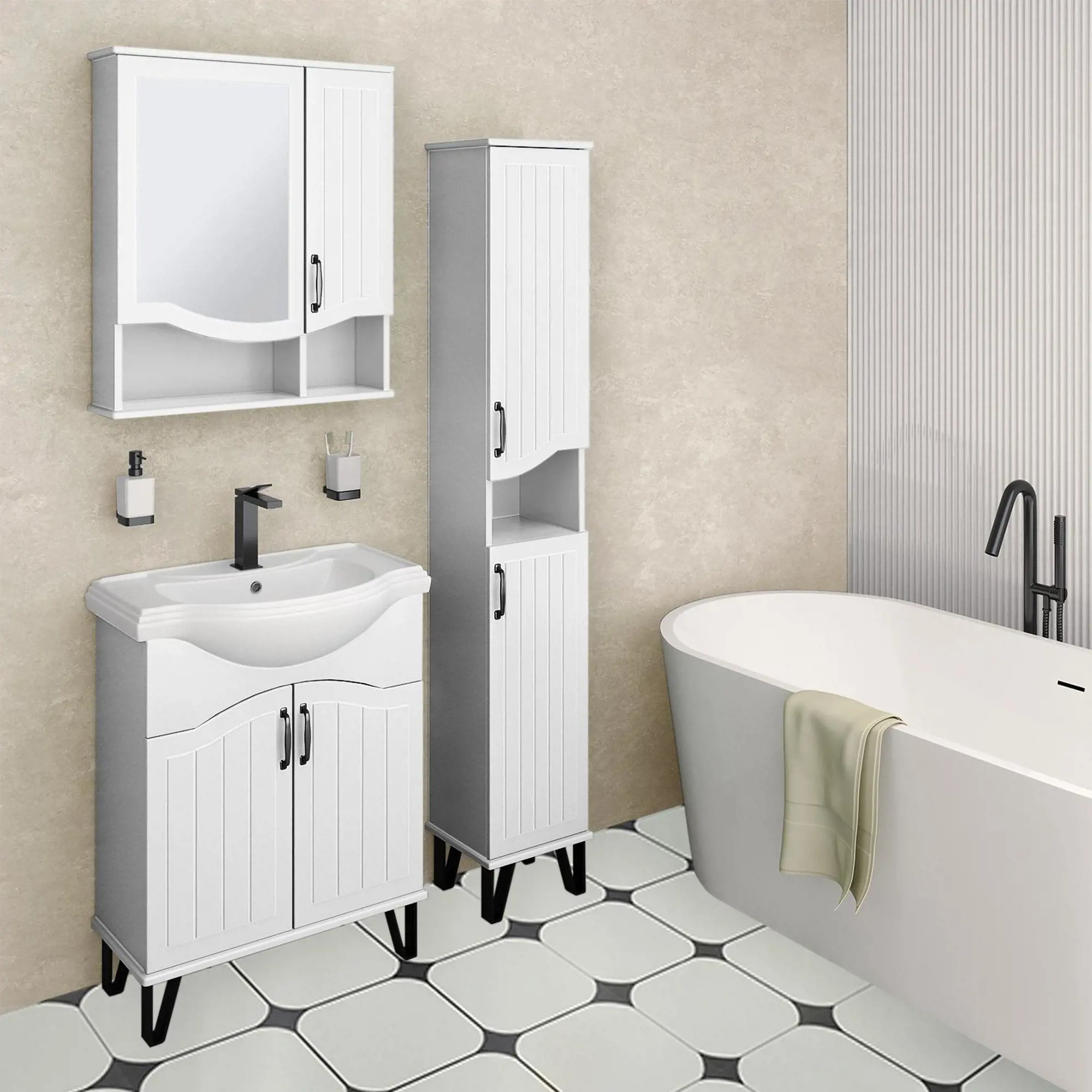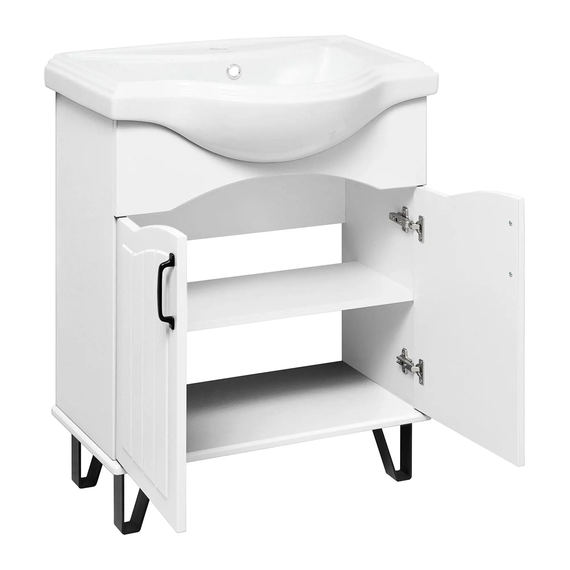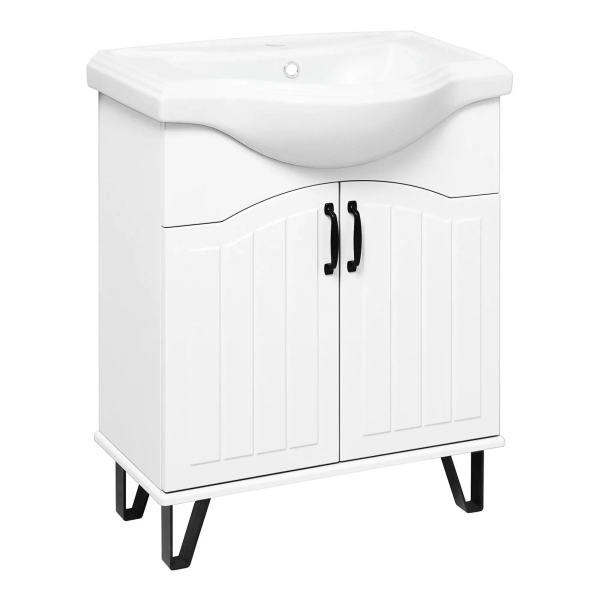 Тумба с раковиной Runo МАРСЕЛЬ - оригинальное и яркое решение для оснащения ванной комнаты. Тумба под раковину МАРСЕЛЬ (напольная) выполнена в модном цвете с вертикальной "карандашной" фрезеровкой. Тумба в ванную имеет две распашные дверцы и одну внутреннюю полку. В комплекте идут петли со встроенным доводчиком, 2 черные ручки, 4 ножки. Тумба комплектуется керамической раковиной "Классик" (660*420 мм). Раковина имеет глубину