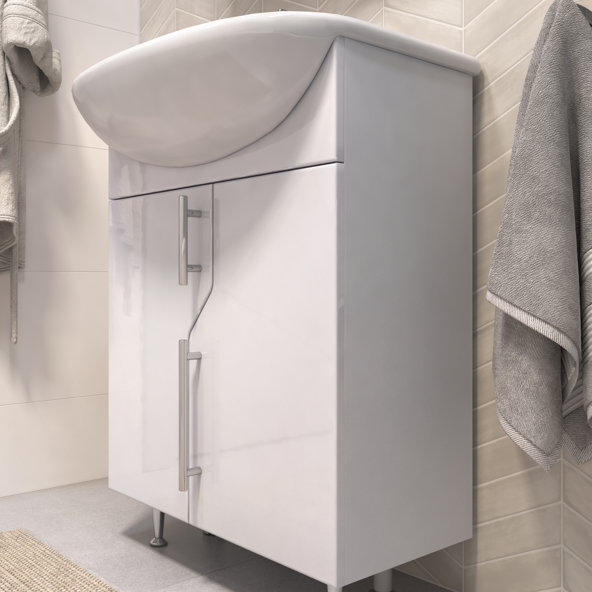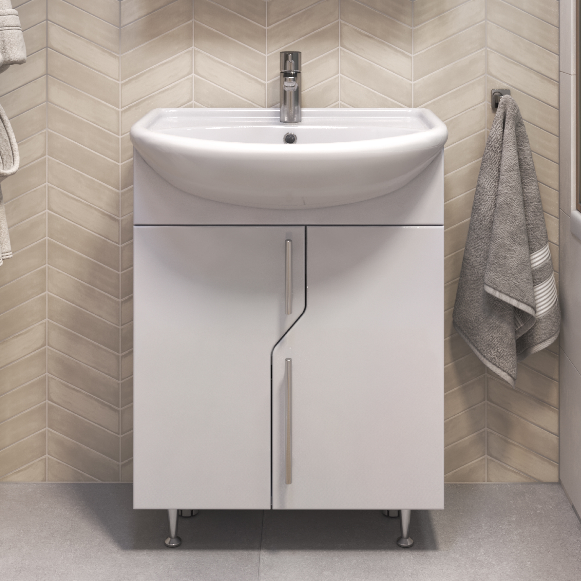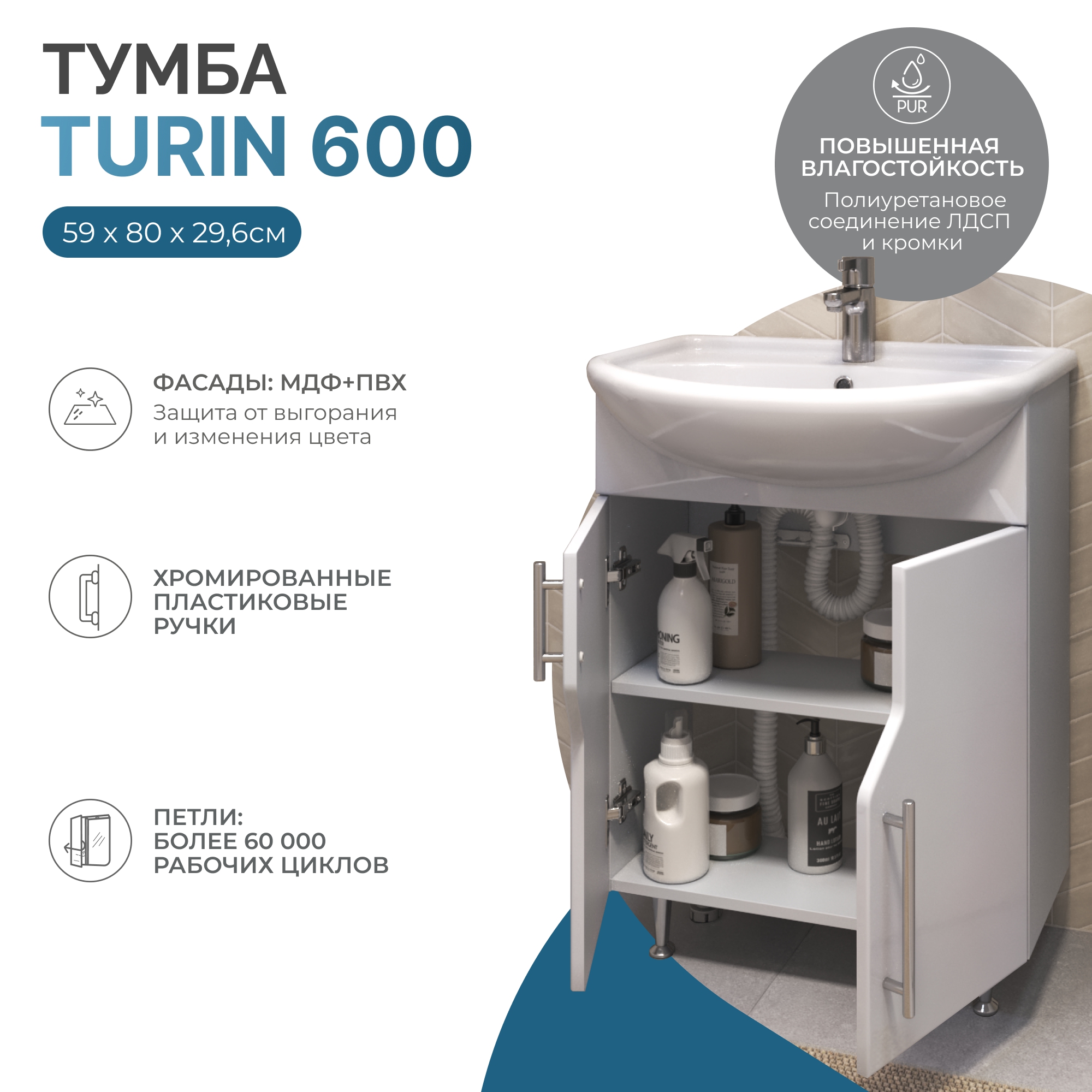 Тумба Vigo Turin 600-2-0 под раковину Уют 600 выполнена из влагостойкого ламинированного ЛДСП с фасадами из МДФ, которые покрыты пленкой с защитой от выгорания и изменения цвета, а петли имеют более 60 000 рабочих циклов.