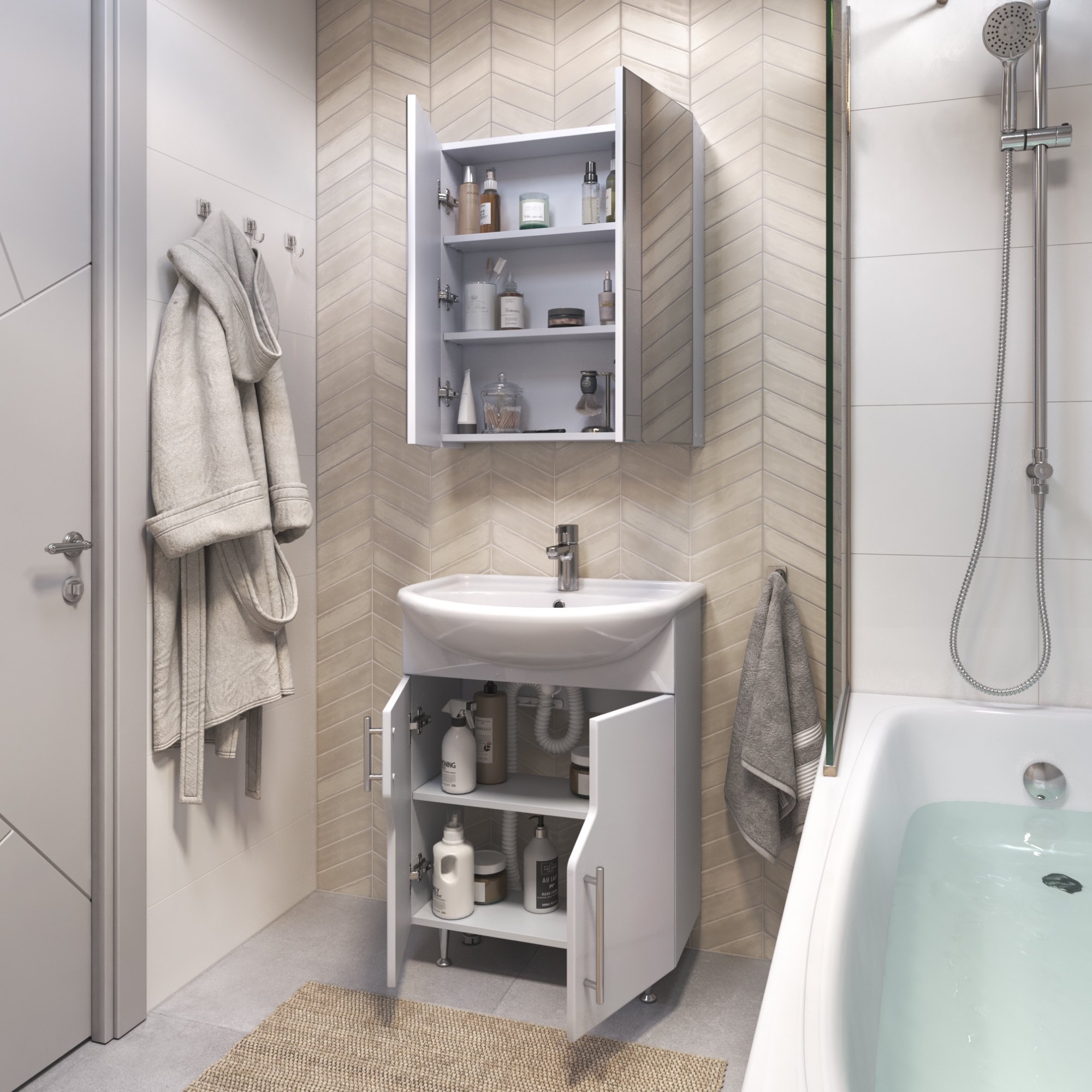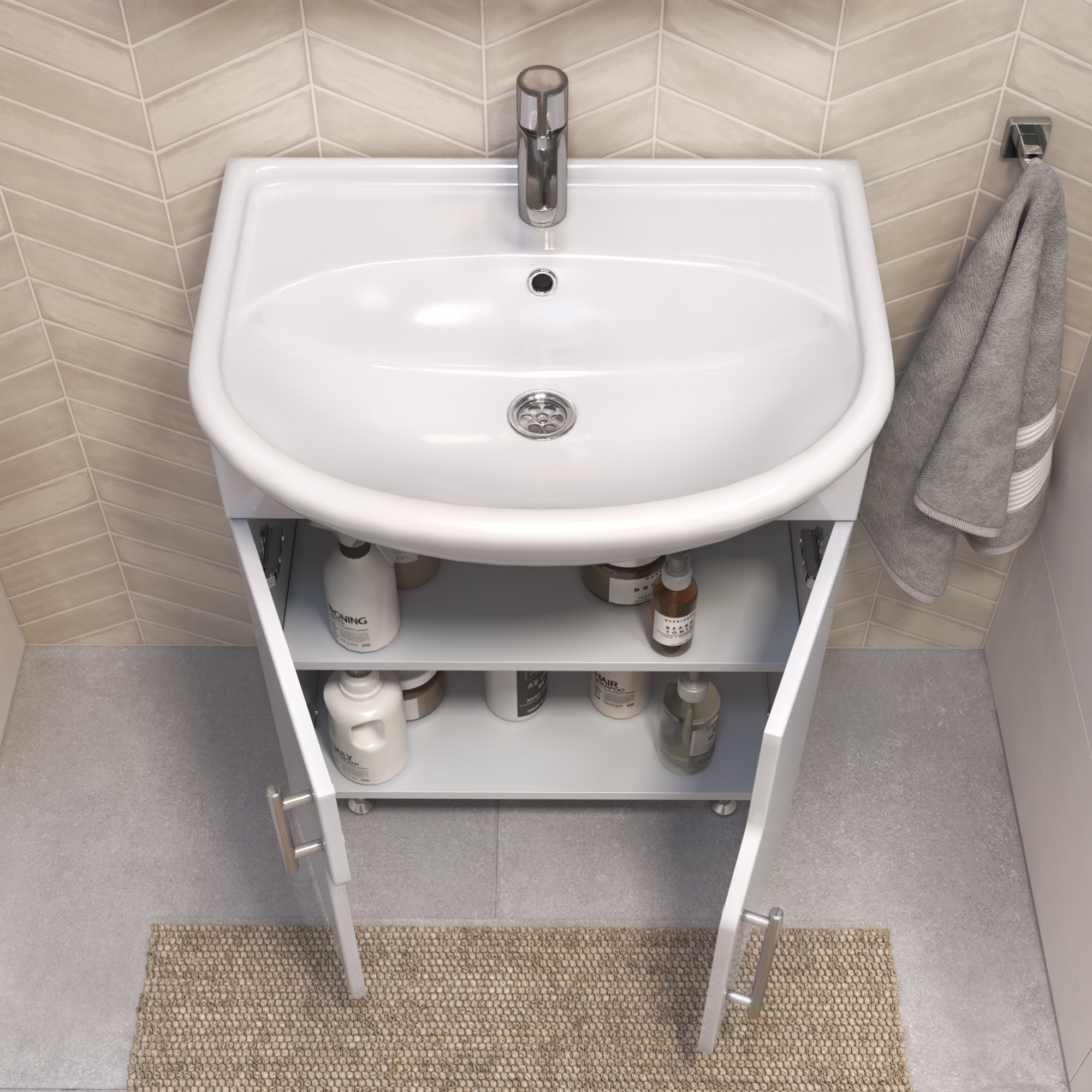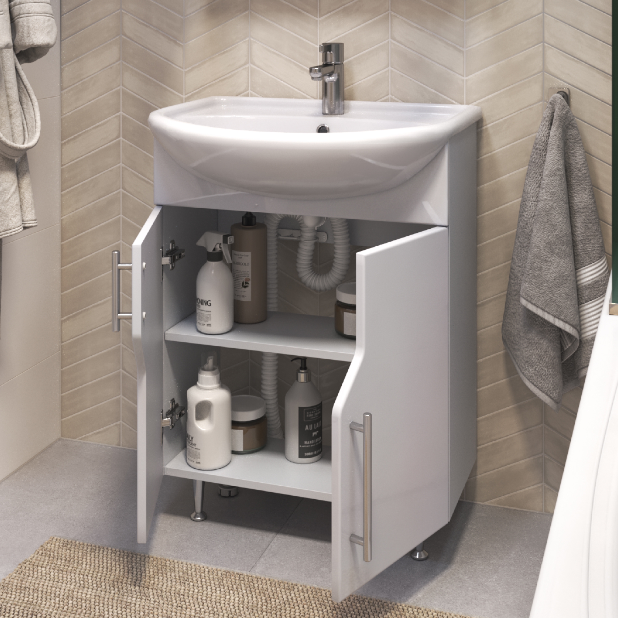 Тумба Vigo Turin 600-2-0 под раковину Уют 600 выполнена из влагостойкого ламинированного ЛДСП с фасадами из МДФ, которые покрыты пленкой с защитой от выгорания и изменения цвета, а петли имеют более 60 000 рабочих циклов.