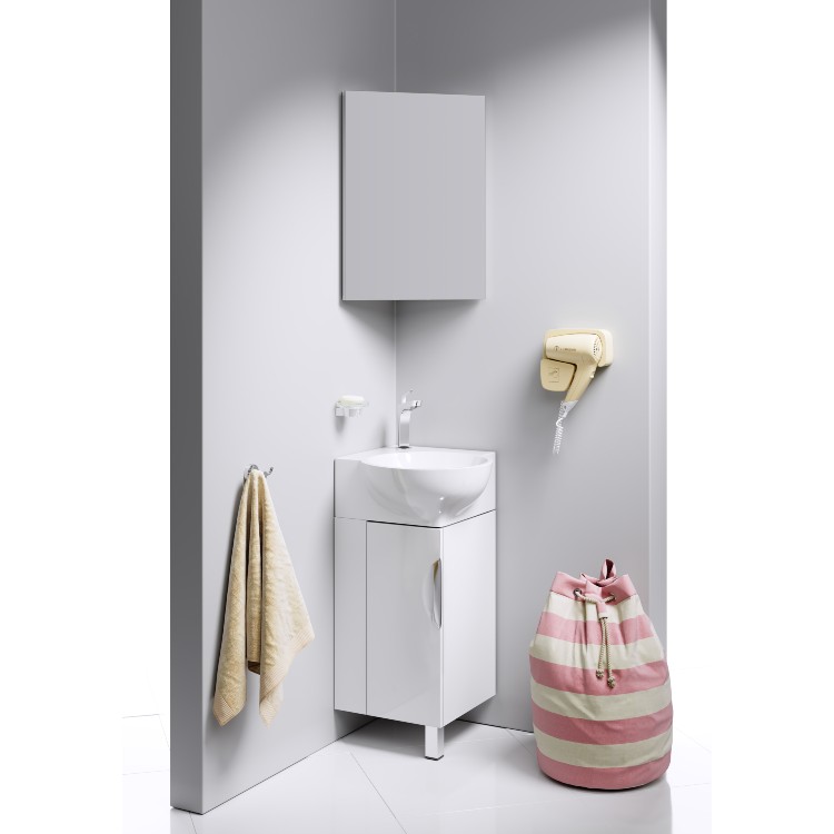 Мебель позволяет эффективно задействовать угловое пространство в ванной комнате. Модель выпускается в размере 45 см. Угловой универсальный левый/правый зеркальный шкаф с одной дверью. Двери оборудованы мебельными петлями с интегрированным доводчиком, обеспечивающим плавное закрывание.