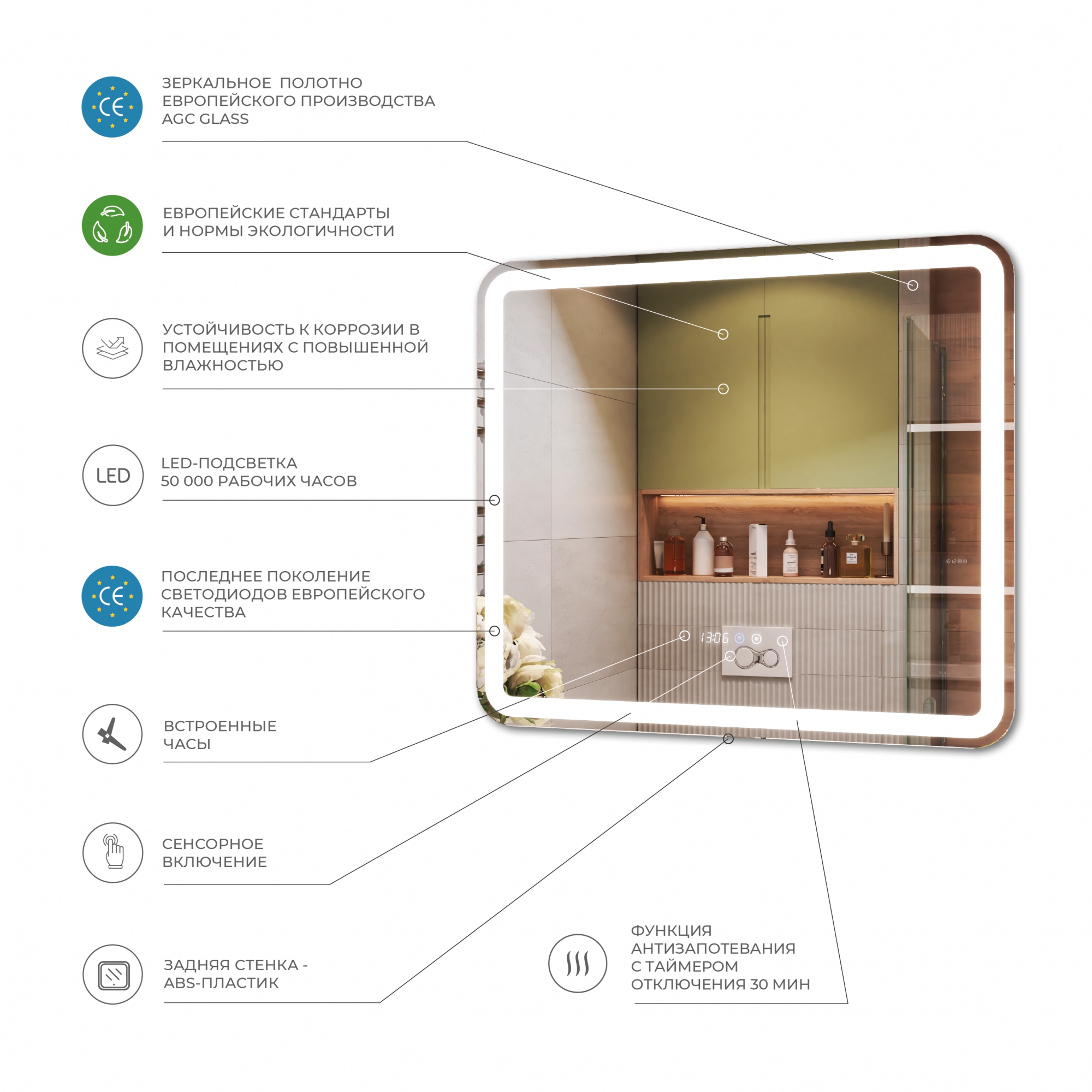 Функция антизапотевания сохраняет сухость и чистоту зеркальной поверхности даже при очень высокой влажности. Управление функциями – сенсорное.