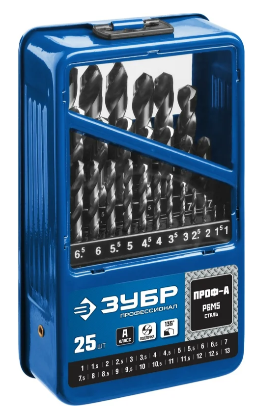 Набор сверл Зубр 29625-H25, предназначен для обработки легированных и углеродистых сталей с пределом прочности до 900Н/мм2,