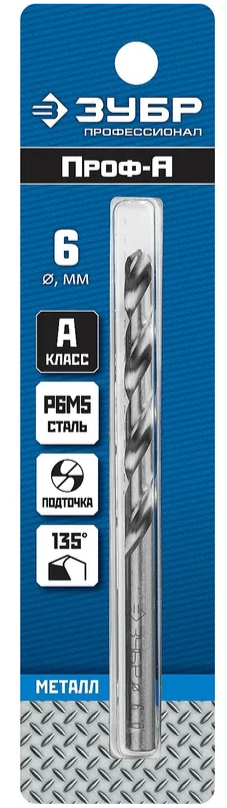 Сверло ЗУБР 29625-6, предназначено для обработки легированных и углеродистых сталей с пределом прочности до 900 Н/мм², цветных металлов, серого чугуна и пластмассы.
