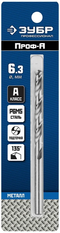 Сверло ЗУБР 29625-6.3, предназначено для обработки легированных и углеродистых сталей с пределом прочности до 900 Н/мм², цветных металлов, серого чугуна и пластмассы.