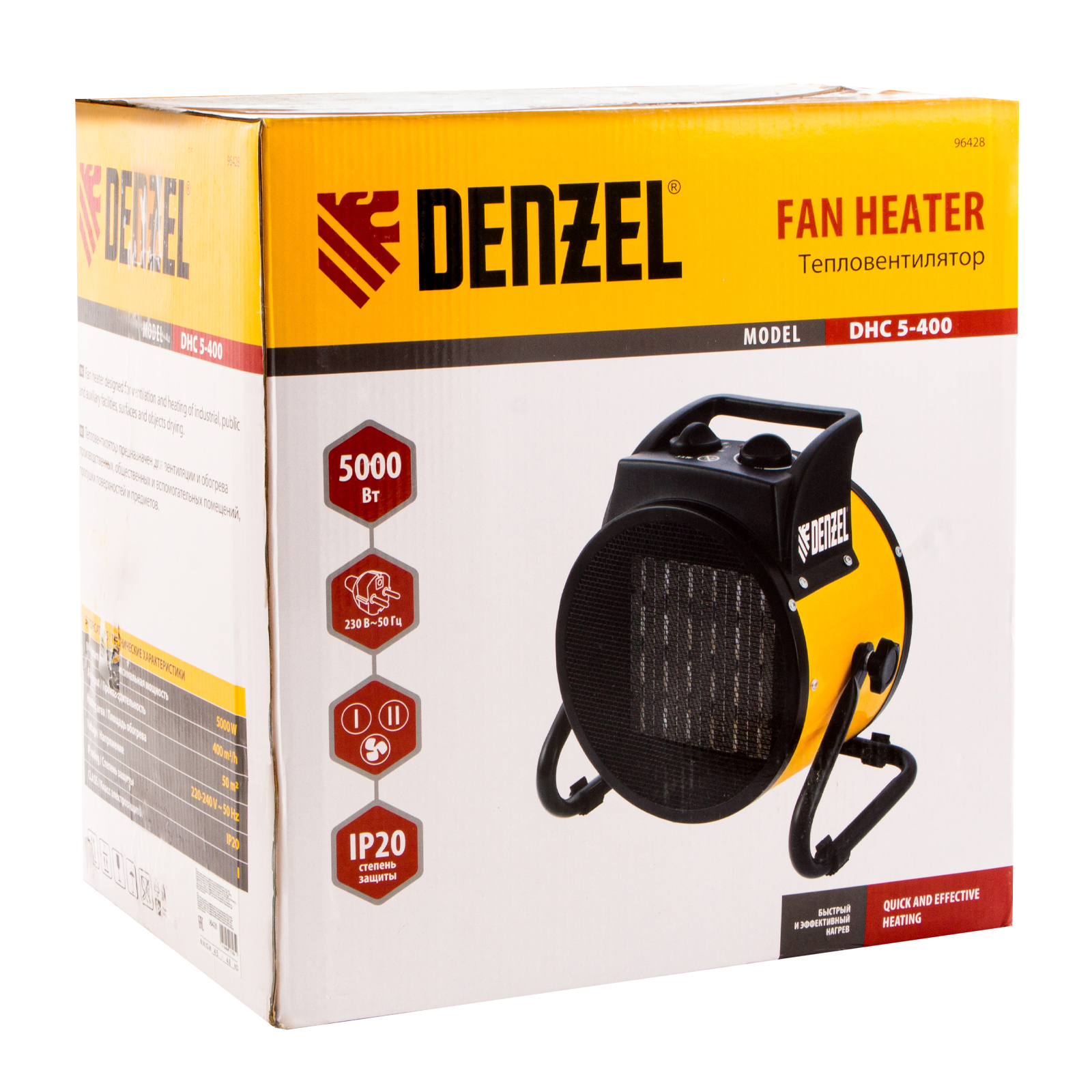 Тепловая пушка (тепловентилятор) Denzel DHC 5-400 96428 с керамическим нагревательным элементом работает на мощности 0,04/3/5 кВт. Пригодится в любую погоду: в холод обогреет помещение, в теплое время года может использоваться